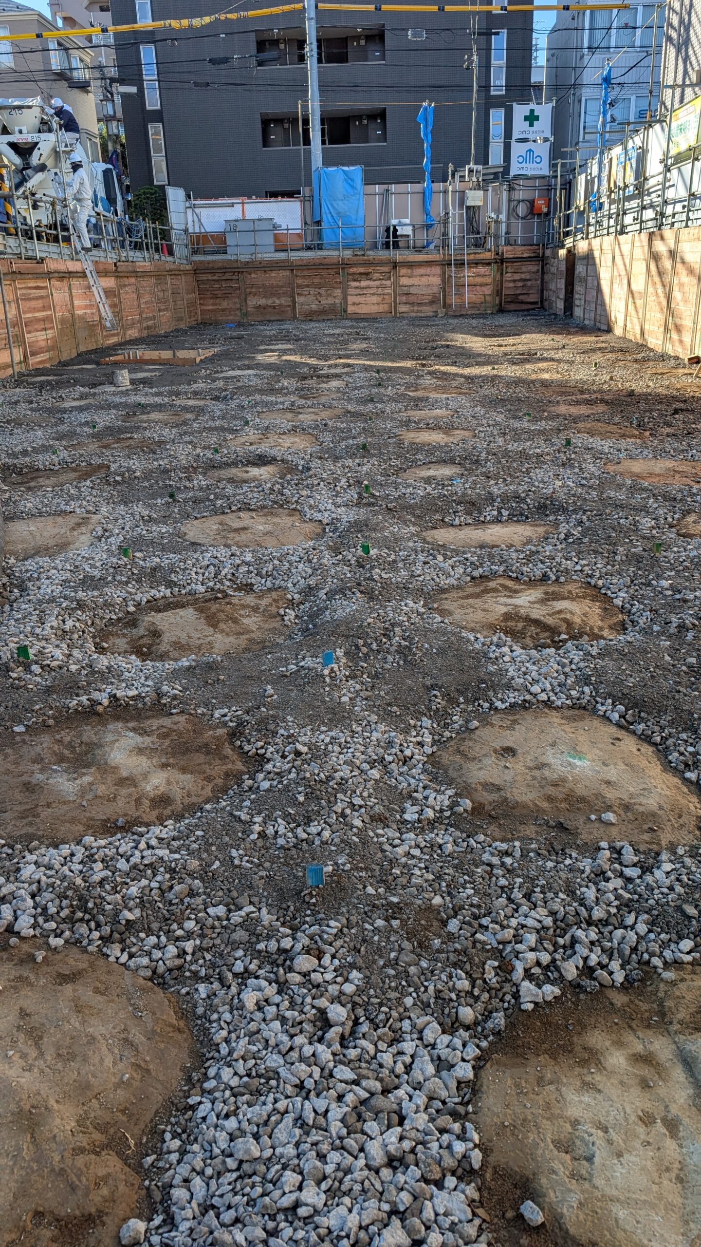 本日から新規のマンション始まりました!来年から始まる躯体コンクリートに向けてまずは捨てコン350㎡年末で忙しく土間屋2名と土工さん4名でやらせていただきました